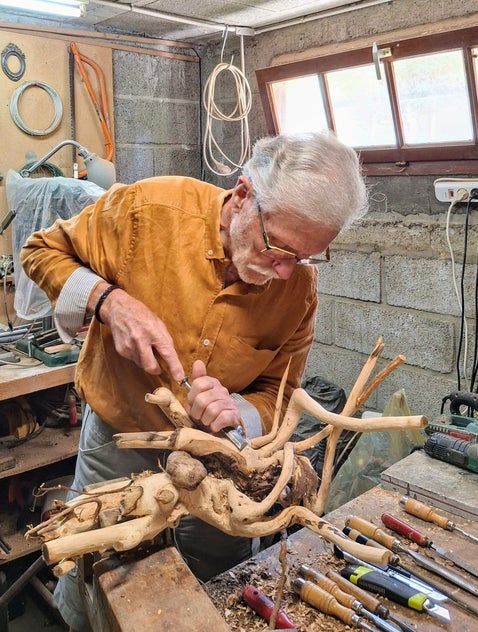 La suite : je pars en quête de matières brute (troncs, souches, branches) puis réalise des personnages et animaux singuliers de toutes tailles et formes, issues de mon imagination.